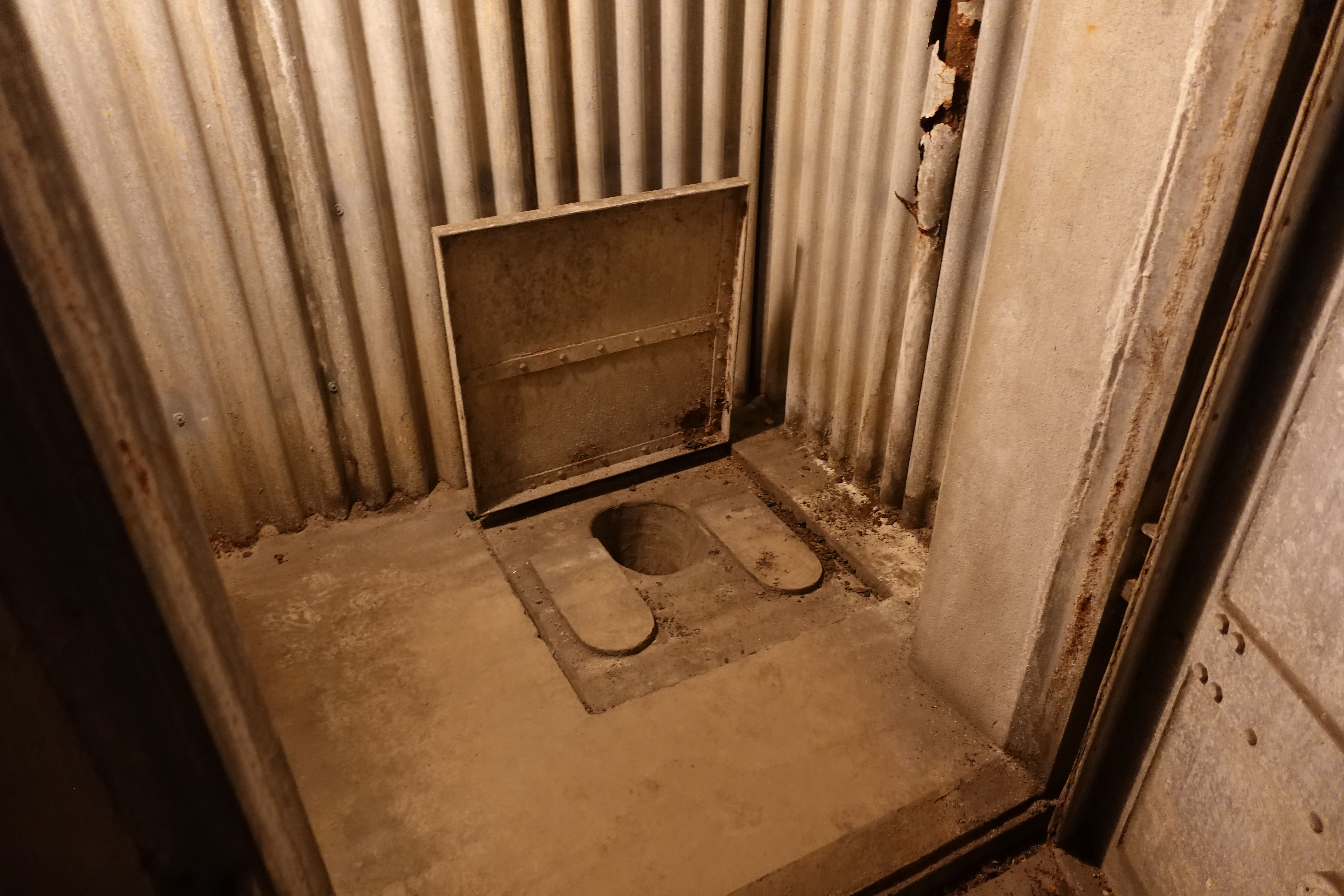 Toilets, the stall walls are missing. But the can that was used when needed is still there. Empty I am glad to say