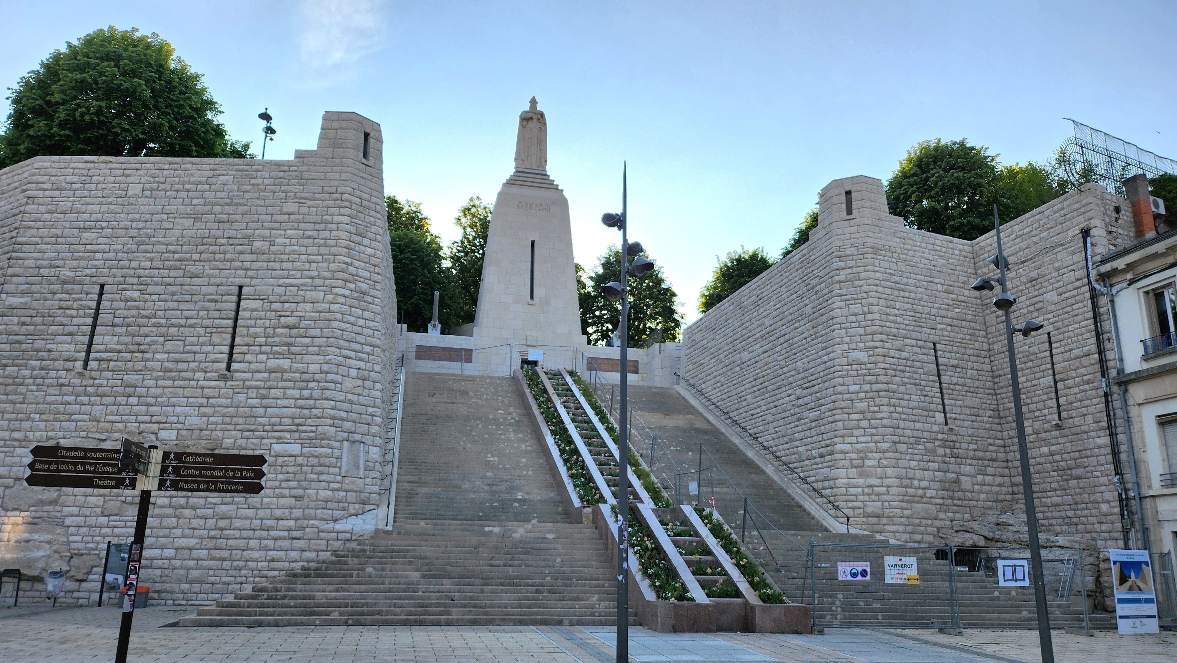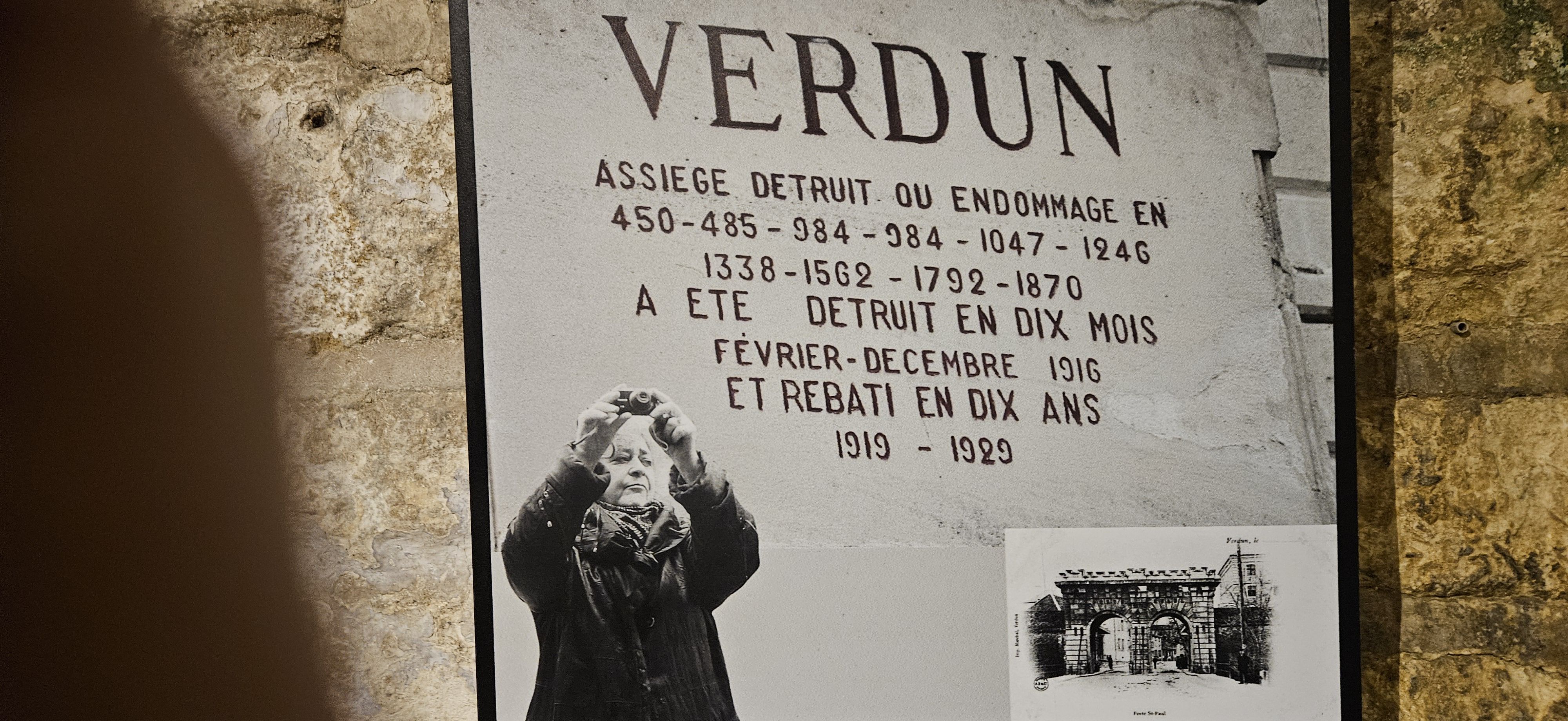 The first line says Verdun Beseiged, destroyed or damaged and the dates from 450 through 1870. Next line is Destroyed in 10 months Feb - Dec 1916. Third line is Rebuilt in 10 years 1919-1929