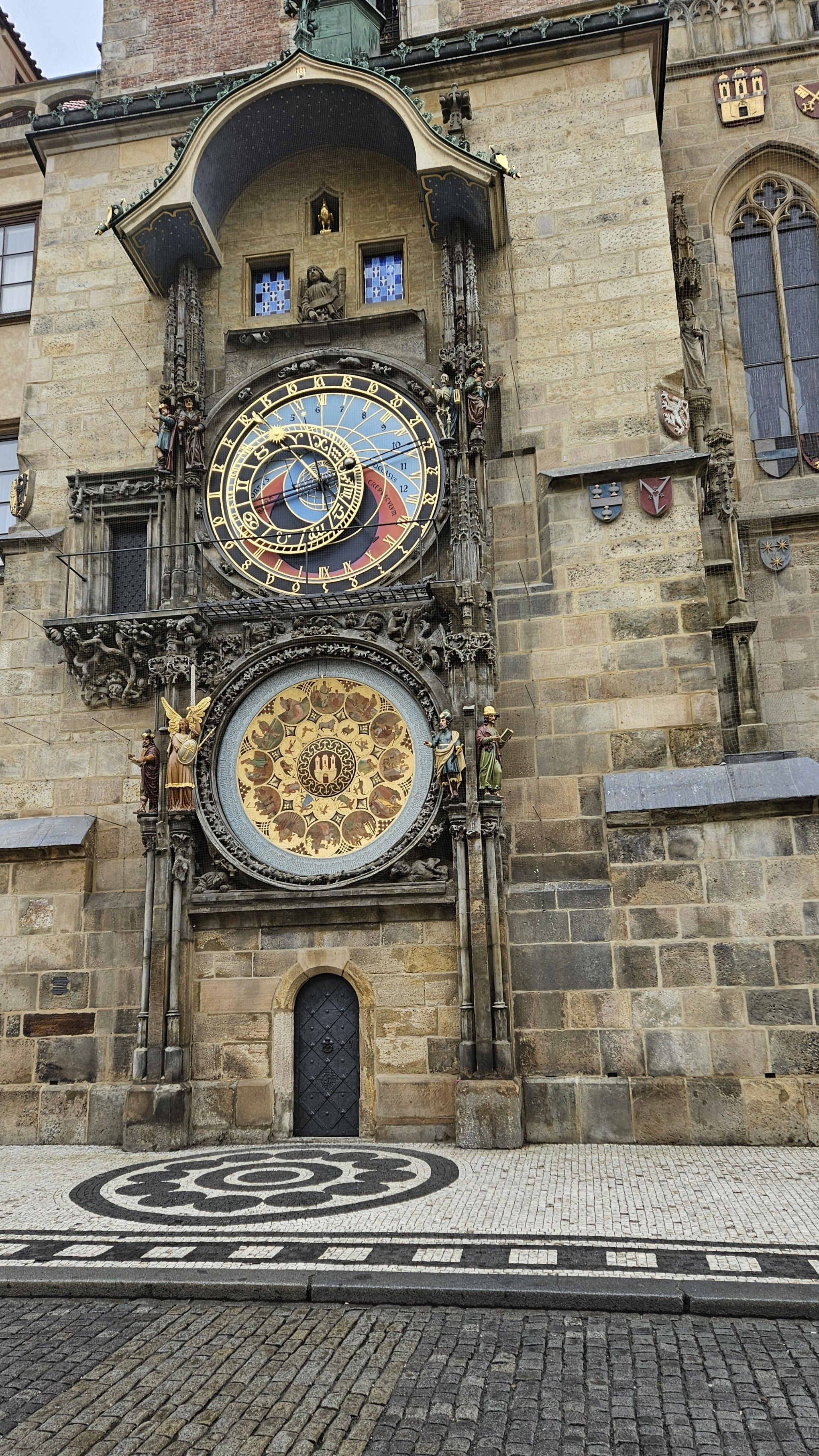 The dial shows the sun and moon positions. Every hour The Walk of the Apostles is a big draw. Those are the golden statues.