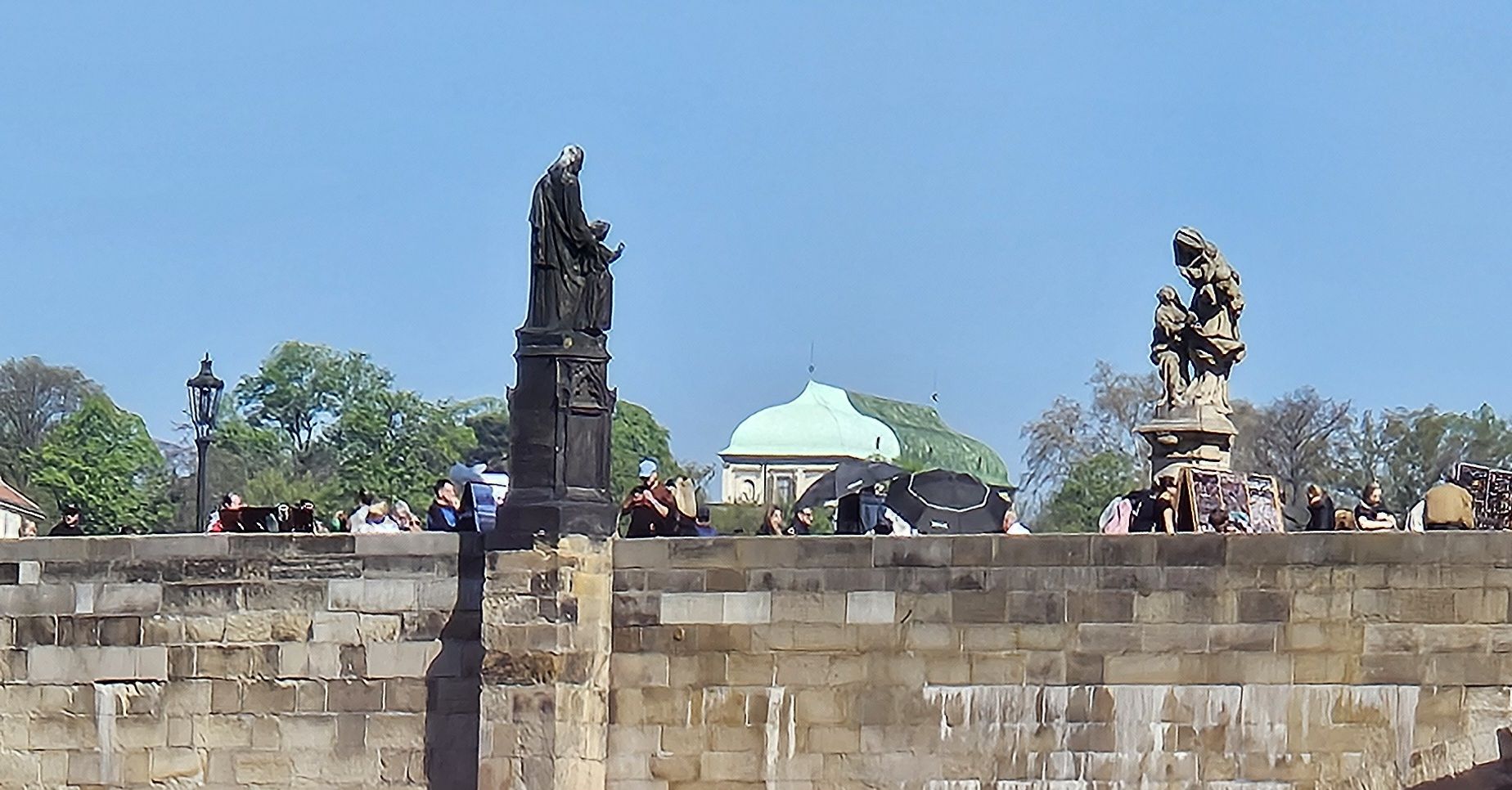 The bridge is lined with statues of saints